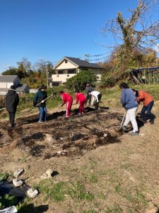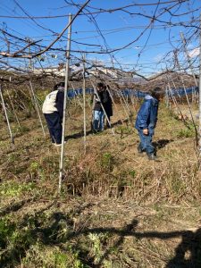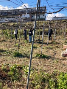 今回は2班に分かれて、ぶどう園での剪定作業と体験農園での土づくりとして鍬で耕していただきました。ディーセント・ファーム かしわらのAさんは高校生に丁寧に鍬の使い方、耕し方を丁寧に教えてながら一緒に作業していました。 高校生の時から障がい者の方々と交流し、とも汗をかく経験はとても意味あることです。