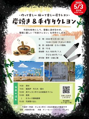 2026年3月17日 / 最終更新日時 : 2026年3月17日 植田剛司 イベント 「炭焼き&手づくりクレヨン」イベントを開催 5月3日(日)10時から製炭炉を設置させていただいている、むろいけ園地で「炭焼き&手づくりクレヨン」イベントを開催します。 「大阪府民の森さま」とともに開催します。 ディーセント・ファーム かしわらの製炭炉は、竹 […]